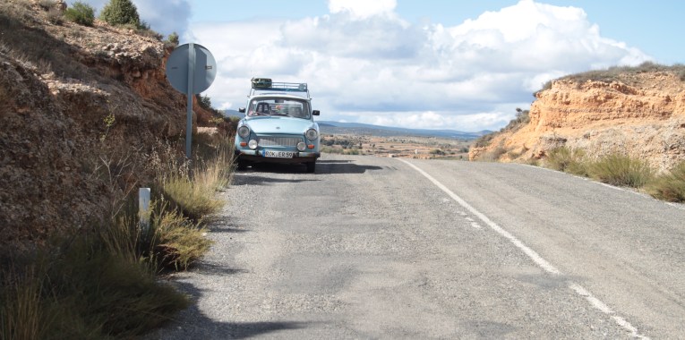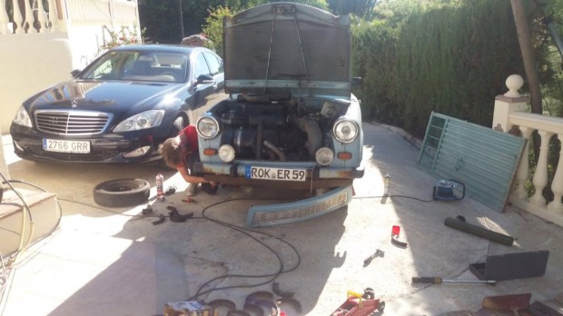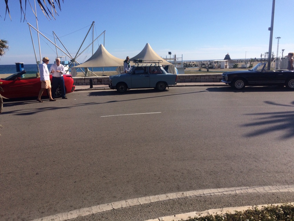 Puerto Banús ist ein Stadtteil von Marbella, in dem die „schönen“ und reichen Leute ihre Ferraris und Oldtimer zur Schau stellen. Ich hab‘ es mir natürlich nicht nehmen lassen, meine Pappe da auch mal hinzustellen. Im nu waren die ganzen teuren Autos ausgestochen, denn so etwas exotisches, wie einen Trabi hat man hier noch nicht gesehen.